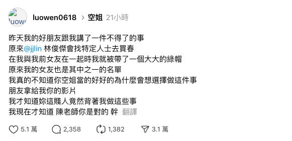 日前一名男網民在社交平台發文,大爆林俊傑嫖妓兼介入他的感情:「原來林俊傑會找特定人士去嫖妓,在我與我前女友在一起時我就被帶了一個大大的綠帽,原來我的女友也是其中之一的名單」,再喊話女友手持私密影片:「我真的不知道你空姐當的好好的為什麼會想選擇做這件事,朋友拿給我你的影片,我才知道妳竟然背著我做這些事」,而且更直接在文中標註林俊傑的帳號,非常大膽!