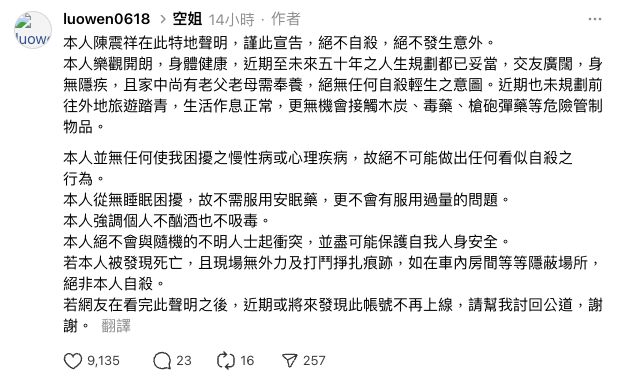 之後,該男網民再發表不自殺聲明,提到自己性格樂觀開朗,身體健康,而且近期至未來五十年之人生規劃都已妥當,交友廣闊,身無隱疾,且家中尚有老父老母需奉養,絕無任何自殺輕生之意圖。帖文一出,即引來大批網民熱議,目前為止已吸納超過5萬人讚好、3萬人轉發。