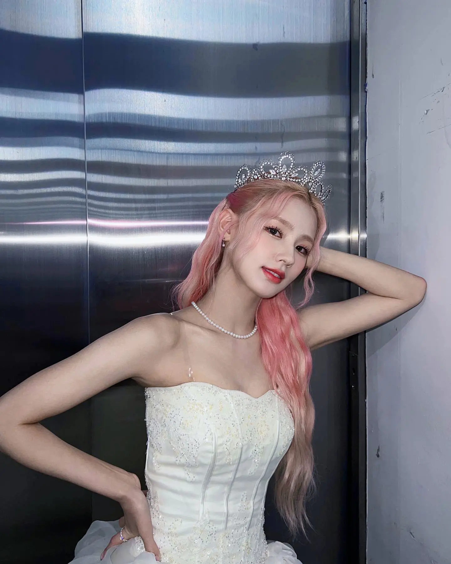 柔和的霧粉色色調輕柔夢幻,不張揚卻又充滿了溫柔的吸引力,為她原本就出眾的仙氣更添一抹柔和的光暈。順直的髮絲自然地垂落在肩上,更顯得清純可人,宛如童話故事中不染凡塵的公主,散發著令人過目難忘的美麗。