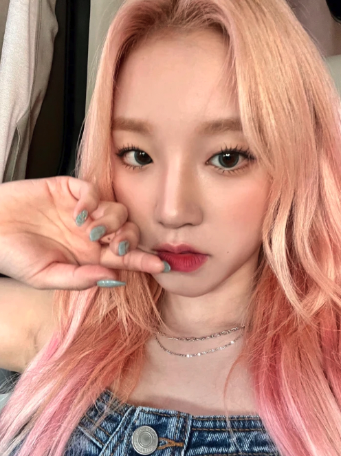 這種帶有橘色調的粉色髮色,巧妙地融合了蜜桃的柔美與暖陽的活力,呈現出一種柔和且富有層次的色彩,如同盛夏熟透的蜜桃般甜美可人,又似灑上落日餘暉的雲朵般溫暖夢幻。不僅能完美襯托出太妍白皙透亮的肌膚,更像是為她的臉龐打上了一層柔光,使原本就精緻的五官更顯柔和立體,散發著甜美又充滿活力的青春氣息,為太妍增添了一份令人心動的魅力。