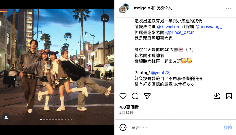 有網友發現雖然粿粿不時在IG與王子互動,但她卻甚少在貼文回覆范姜彥豐的留言,但王子的每則留言都會回覆,甚至在對方生日的時候出Post,老公都沒有這樣的待遇!