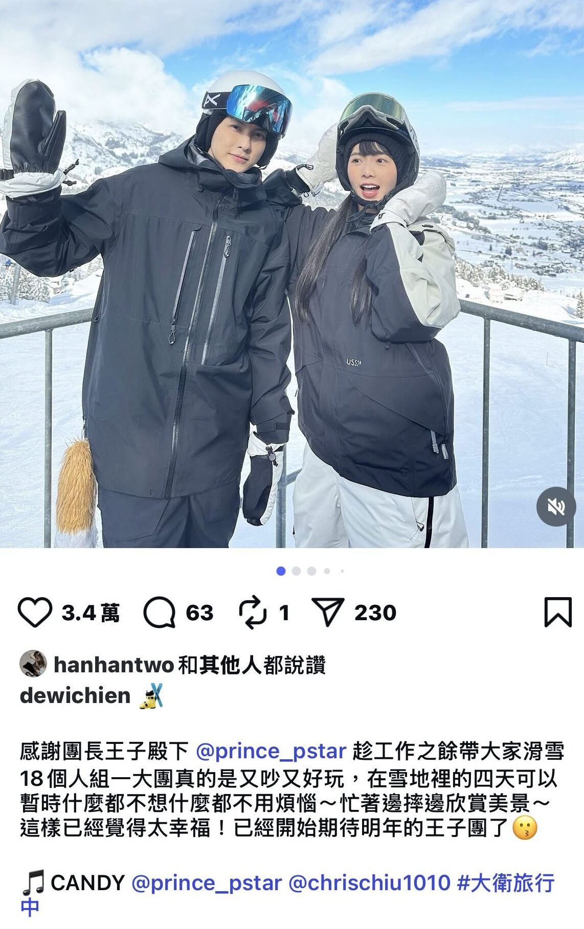 日前王子被爆疑似與粿粿婚內出軌後,網友隨即翻出兩人昔日的曖昧互動,在美國之旅中粿粿被指穿上了王子的外套,又剛好只有兩人穿上「MICKEY」的衣服等~之後又有網友發現王子與另一位人妻簡廷芮的互動同樣無邊界感,在坐摩天輪時將手放在王子腿上,有時候還貼得比粿粿還近 ,一旁的粿粿看到後瞬間露出微妙表情。