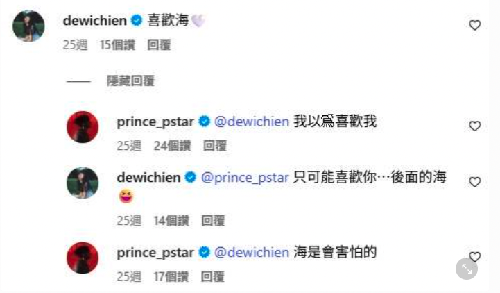 簡廷芮曾在王子貼文留言「喜歡海」,他回「我以為喜歡我」,她再回「只可能喜歡你…後面的海」,引起網友熱議「完全是在調情」、「這是應該對人妻說的話嗎?」